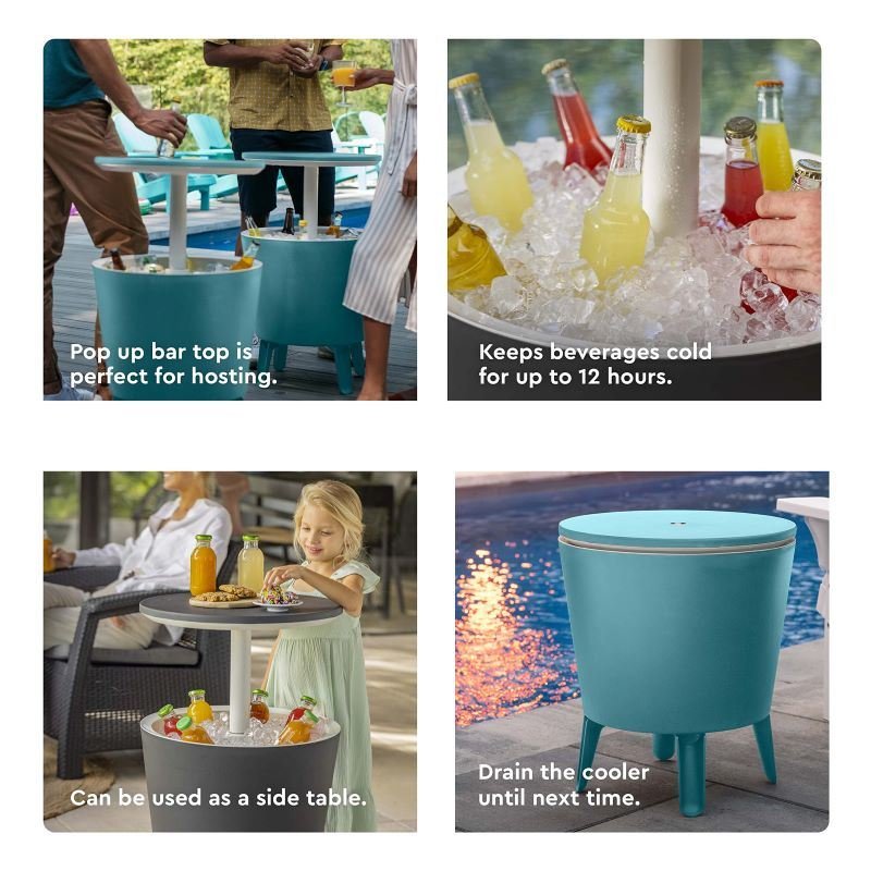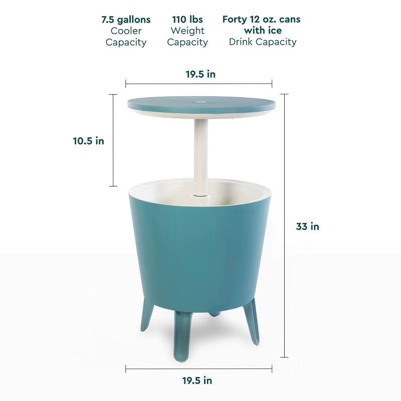 POP UP BAR & HIDDEN COOLER: Lid elevates upwards 10 inches above the rim for use as a patio bar table. The top reveals a hidden cooler with 7.5-gallon capacity. Keep up to forty 12 oz. cans ice cold.
