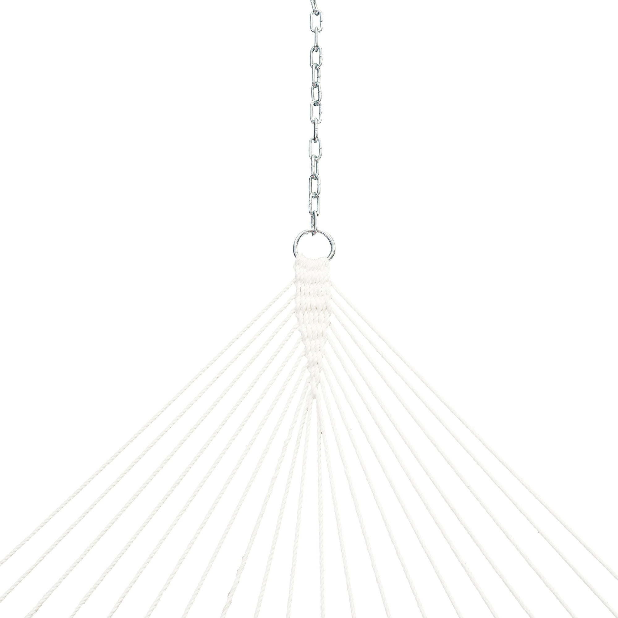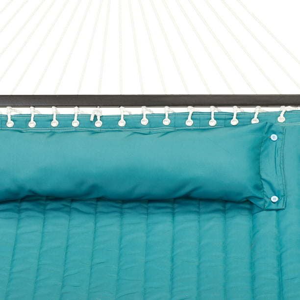 Relax with a friend in a quilted double hammock with pillow. Sized to comfortably hold two adults, you can set up this hammock just about anywhere: in your backyard, on the deck, or under your favorite tree. This full-size hammock comes complete with a matching bolster pillow so you have a comfortable place to relax, read, or nap outdoors. Made from a durable 100% polyester in a bright teal green color, the hammock has durable rope construction, macrame clewed ends, and strong hardwood spreader bars that make it easier to get in and out.