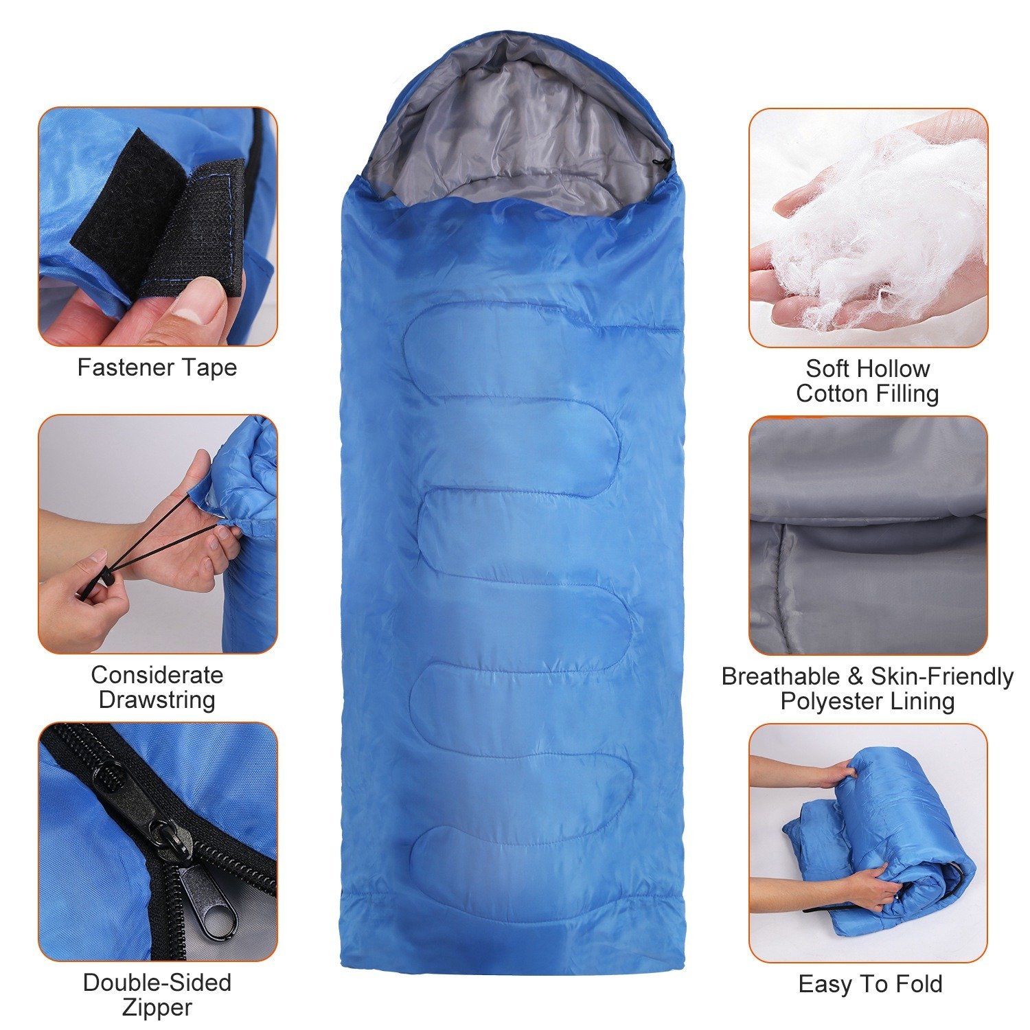 *Warm & Soft Sleeping Bag*:Made of 170 polyester for lining and filled with soft hollow cotton for filling; the bag is warm; lightweight; durable and skin friendly; providing you a warm and cozy sleep in cold damp night after a tiring day of hiking; camping; travel or any other exploration. No more lugging around excessive weight in your backpack.