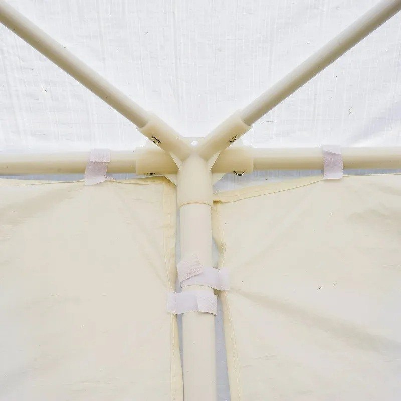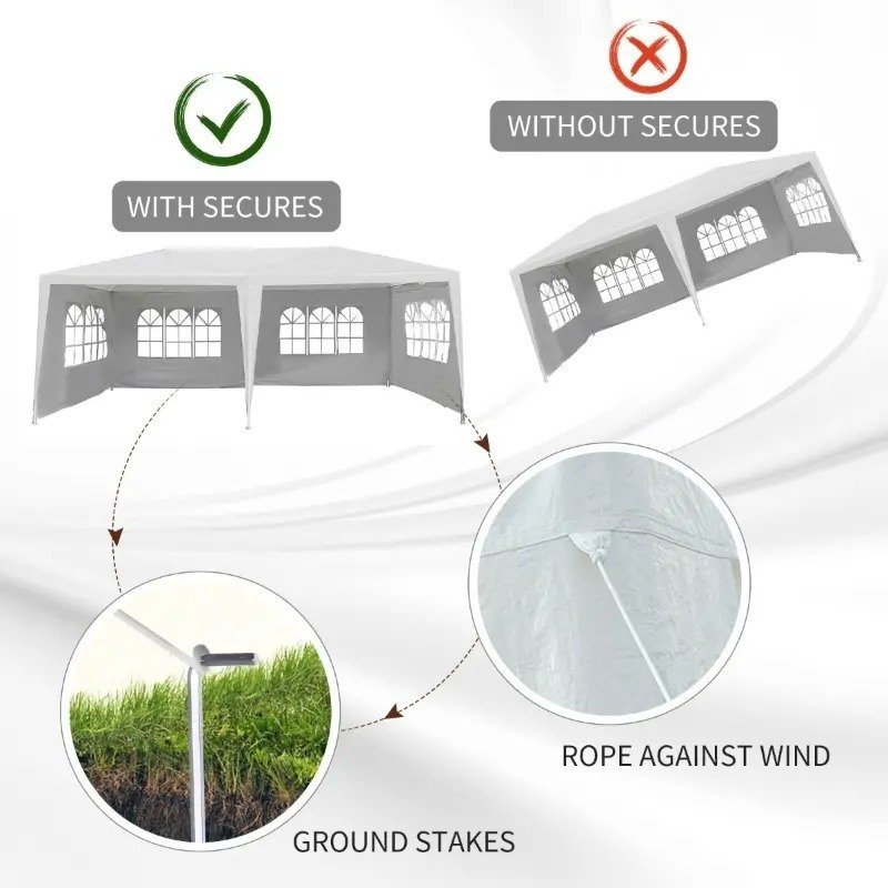 1.The polyethylene fabric cover of the party tent prevents the weather from ruining your day, protecting you from both UV rays to raindrops. There are 4 guy ropes and 10 ground stakes enclosed, perfect for making your new cabana nice and tight.